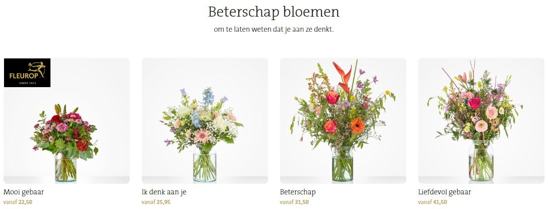 Rozen: Rozen zijn prachtige bloemen die perfect zijn om iemand beterschap te wensen. Ze zijn verkrijgbaar in verschillende kleuren en hebben elk hun eigen betekenis. Roze rozen staan bijvoorbeeld voor dankbaarheid en waardering, terwijl gele rozen staan voor vriendschap en blijdschap.